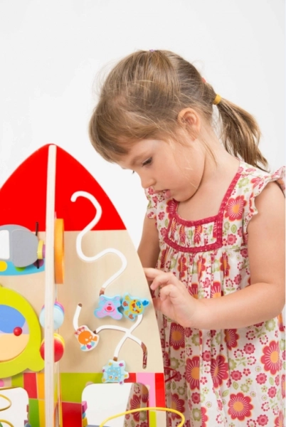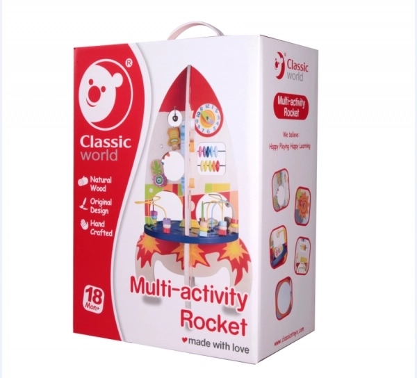 Tento dřevěný hrací stůl ve tvaru rakety je ideální pomůckou pro rozvoj základních dovedností malých dětí. Jeho interaktivní design nabízí velké množství aktivit, které podněcují zvídavost a pomáhají zlepšovat motorické a kognitivní schopnosti dětí.