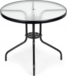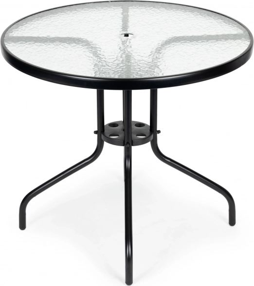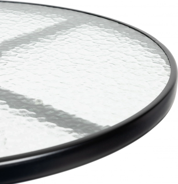 Kulatá deska z tvrzeného „Water Wave“ skla (Ø 80 cm) je pevná, snadno se čistí a má středový otvor (Ø 2,5 cm) pro pohodlné upevnění slunečníku.