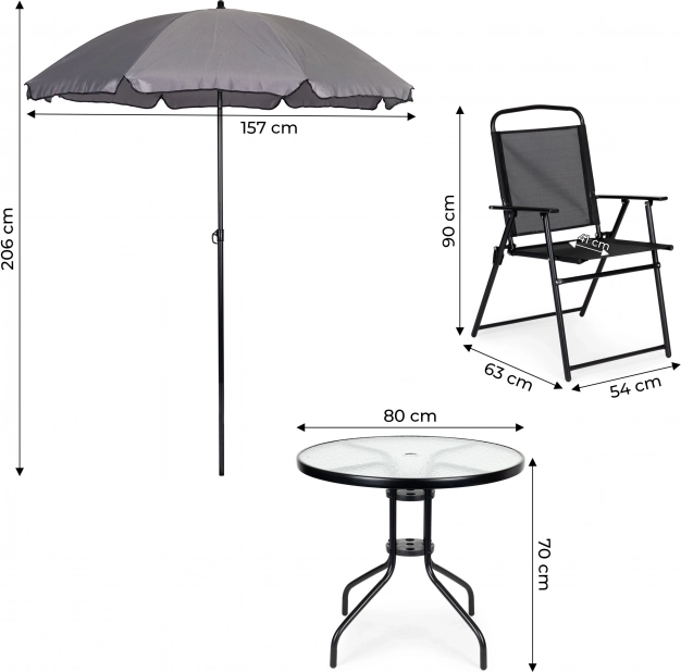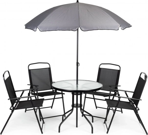 Kulatý stůl s deskou z tvrzeného „Water Wave“ skla nabízí odolnost a snadné čištění. Čtyři skládací židle z prodyšného textilenu se přizpůsobí tělu, rychle schnou a zvládnou zátěž až 150 kg na židli. Díky otvoru uprostřed stolu (Ø 2,5 cm) jednoduše upevníte přiložený slunečník s nastavitelným sklonem pro maximální ochranu před sluncem.