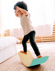 Balanční deska LULILO AJLO je všestranná pomůcka pro aktivní hru i domácí cvičení. Díky zakřivenému tvaru přirozeně trénuje stabilitu těla, posiluje střed (core) a zlepšuje držení. Tyrkysová plst na spodní straně dodává styl a zároveň tlumí hluk a zajišťuje přilnavost.