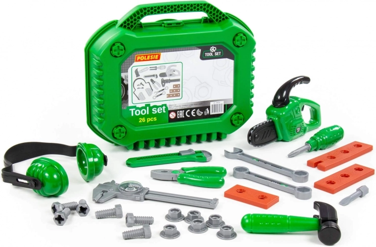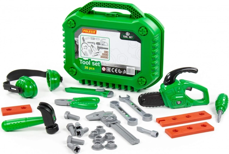 Obsah sady: řetězová pila (1 ks), stavební sluchátka, posuvné měřidlo, stavební nůž, kleště, kladivo, šroubovák s vyměnitelnými nástavci, otevřený klíč, stranový klíč, šrouby (6 ks), matice (6 ks), spojovací destičky a kufřík na nářadí.