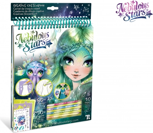 Nebulous Stars Kreativní sketchbook Marinia. 250 ks nálepek, 35 náčrtních stran, 80+ šablon, 5 barevných tužek, 3 ks šablon se vzory, 8 kreslících technik. Display box 6 ks.