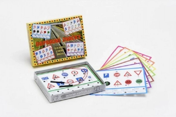 Didaktická hra pro děti od 6 let, která učí 80 nejběžnějších dopravních značek pomocí elektronického zkoušecího obvodu. Děti hravě rozpoznávají značky a správným přiřazením se rozsvítí zelené světélko.