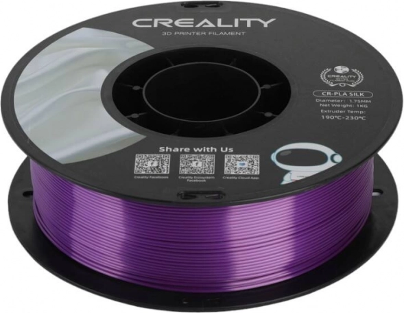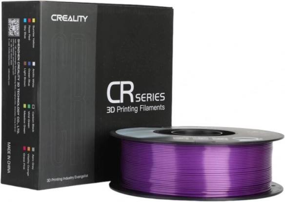 Elegantní PLA filament CREALITY CR-Silk ve fialové barvě nabízí hedvábný kovový lesk, hladký bezproblémový tisk až 100 mm/s a vysokou kompatibilitu s tiskárnami Creality. Vyroben z ekologického PLA s nízkou smrštivostí a odolností proti deformaci.