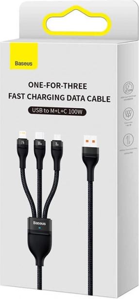 USB kabel Baseus Flash Series 3v1 je ideální pro ty, kteří potřebují rychlé, bezpečné a efektivní nabíjení několika zařízení najednou. Díky jeho univerzálnosti můžete snadno dobíjet chytré telefony, tablety, powerbanky a další zařízení s konektory USB-C, Micro USB a Lightning.