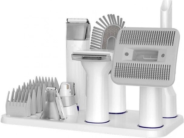 Součástí balení je přesný zastřihovač chlupů mezi polštářky tlapek, brousek na drápky a více druhů nástavců pro různou délku a typ srsti. Díky objemné nádobě 1,5 l a praktickému úložnému příslušenství je údržba jednoduchá a hygienická – ideální řešení pro každodenní péči doma.