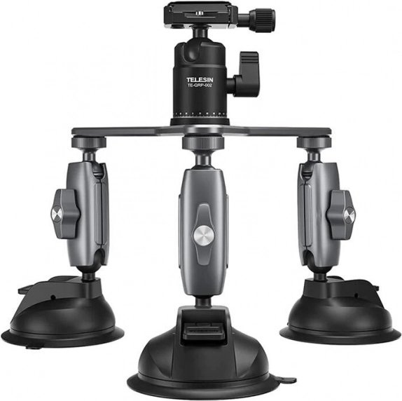 Telesin tříramenný přísavný držák je spolehlivé řešení pro natáčení v autě i mimo něj. Tři silné přísavky poskytují maximální stabilitu na kapotě, skle, dveřích či jiných rovných a hladkých površích. Otočná hlavice s možností jemného nastavení vám umožní přesně nastavit ideální úhel záběru.