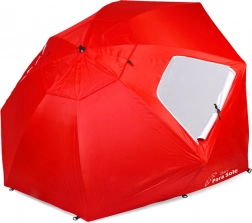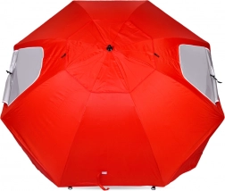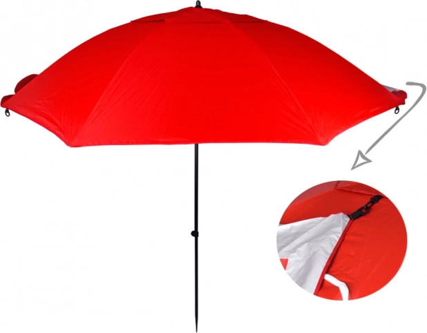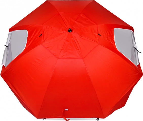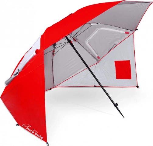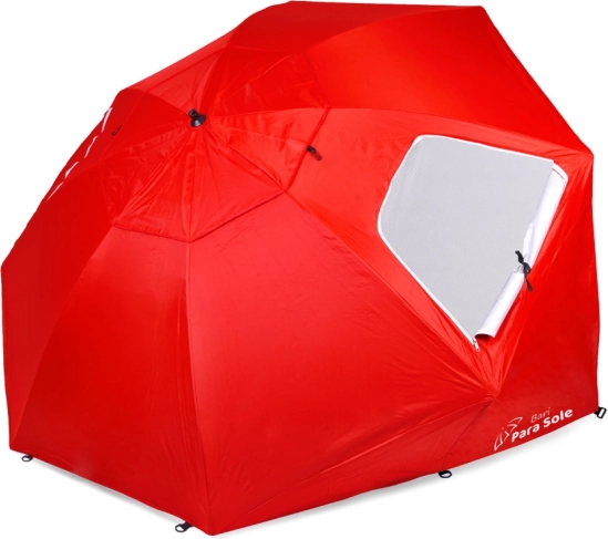 Červený plážový slunečník s ochranou UPF 50+ poskytne spolehlivý stín a pohodlí na pláži i na zahradě. Díky robustní konstrukci, větracímu otvoru, dvěma oknům s moskytiérou a rychlému sestavení během pár sekund zvládne horko, vítr i lehký déšť. Součástí je přenosný obal, kolíky a šňůry pro stabilní ukotvení.