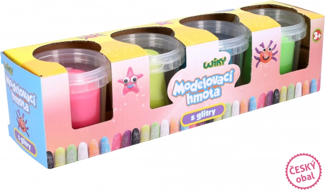 - 4 kelímky modelíny s glitry: růžová, modrá, zelená, žlutá