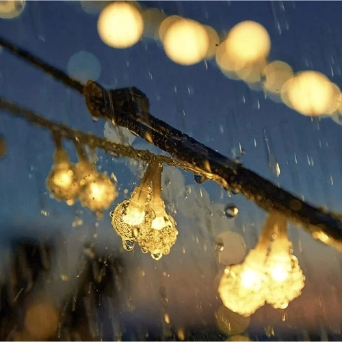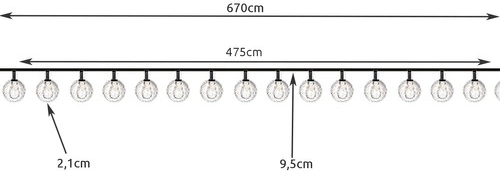Girlanda vyzařuje teplé žluté světlo, což je ideální pro atmosférické osvětlení. Kuličky jsou rozmístěny ve vzdálenosti 9,5 cm od sebe na dlouhém zeleném kabelu, který téměř neviditelně splývá s okolní zelení.
