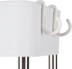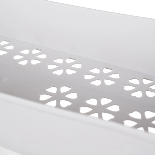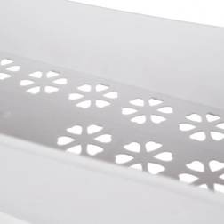 Kombinace pevně lícovaných spojů z nerezové oceli a kvalitního PP zajišťuje stabilitu a dlouhou životnost. Perforované dno polic s květinovým motivem nejen zkrášlí interiér, ale také zlepšuje odvod vlhkosti. Čtyři otočná kolečka umožní plynulé přesuny i ve stísněných prostorech a praktické háčky po stranách udrží ručníky, houbičky či kartáče po ruce.