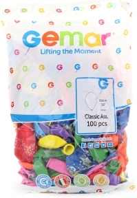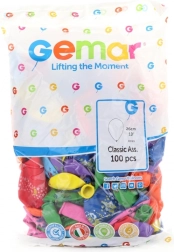 Barevné balónky značky Gemar v balení po 100 kusech, ideální pro výzdobu a oslavy, dodají každé příležitosti živost a radost.