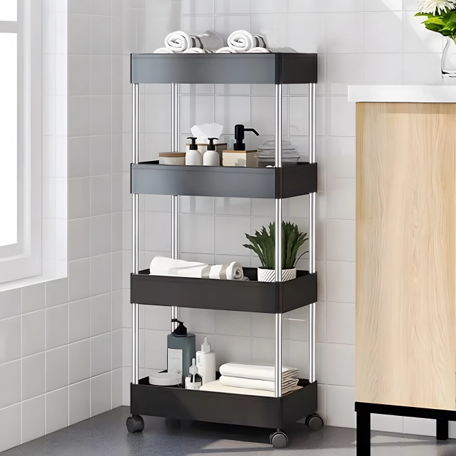 Čtyři praktické police poskytnou dostatek prostoru i v úzkých místech – ideální na kosmetiku, ručníky či čisticí prostředky.