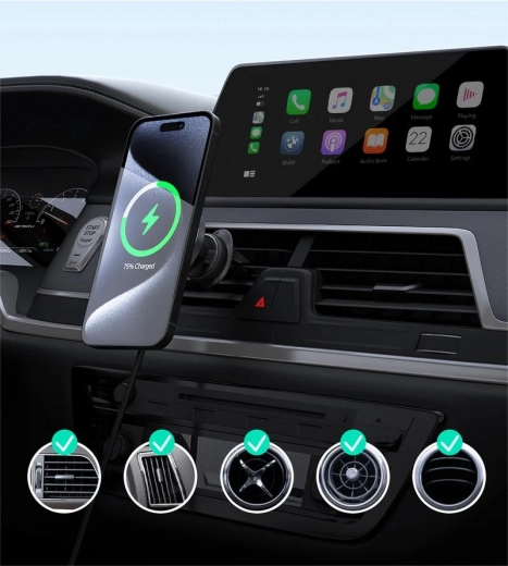 Užijte si pohodlné a stabilní uchycení telefonu s rychlým bezdrátovým nabíjením 15 W. Magnetická technologie držáku spolehlivě udrží zařízení i na nerovnostech a nabije například iPhone z 15 na 50 % přibližně za 30 minut. Elegantní provedení s prvky z tvrzeného skla skvěle ladí s interiérem vozu.