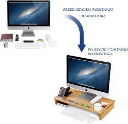 Elegantní bambusový stojan pod monitor zvedne obrazovku do ergonomické výšky a zároveň poslouží jako praktický organizér. Nabízí přihrádky na telefon, tužky a drobnosti, vyhrazené místo na hrnek a prostor pro klávesnici a myš pod stojanem. Přírodní vzhled a odolný bambus zajistí pořádek na stole i pohodlnější držení těla při práci.