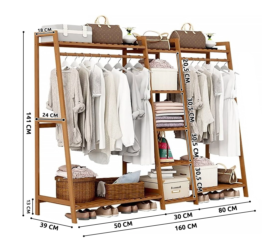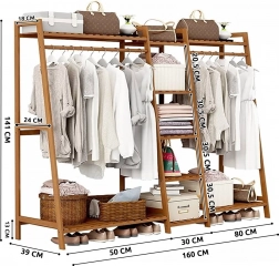 Dvojitý bambusový stojan na oblečení s délkou 160 cm kombinuje prostorné věšení a chytré policové úložiště. Nabízí horní i spodní polici pro krabice a doplňky, pět otevřených polic po straně a praktický háček na klobouk či deštník. Přírodní bambus dodává teplý vzhled a zároveň je odolný a šetrný k životnímu prostředí.