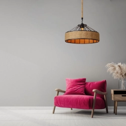 Kruhové stínidlo s černým kovem a opletem z přírodního lana dodá prostoru teplý, autentický charakter a stane se výraznou dekorací.