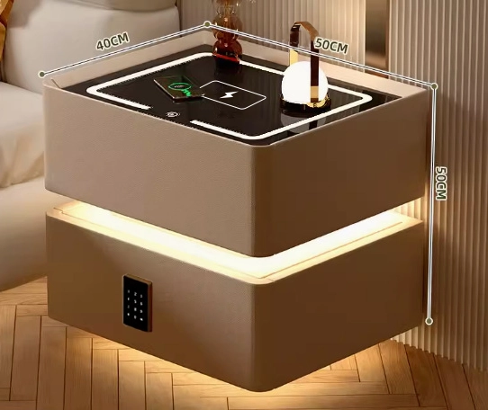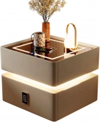Elegantní chytrý noční stolek v béžové barvě přináší do ložnice moderní design a praktické funkce. Nabízí integrované LED osvětlení pro jemné ambientní světlo, bezdrátové nabíjení telefonu přímo na horní desce a čelní digitální panel s kódovým zámkem pro bezpečné uložení drobností.