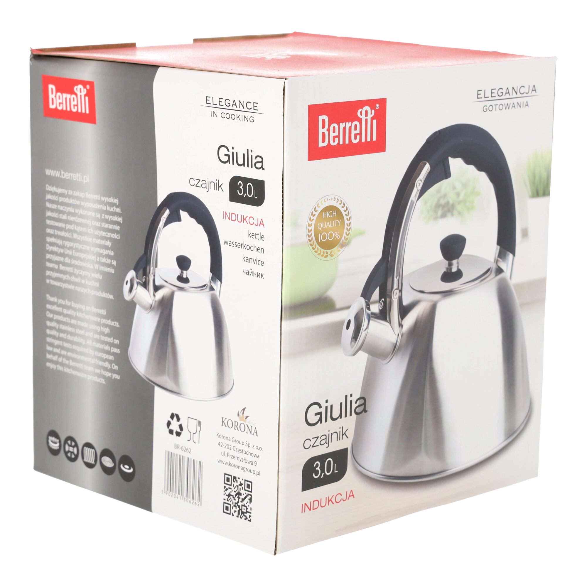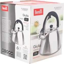 Stylová čajová konvice BERRETTI GIULIA s objemem 3,0 l z kvalitních materiálů nabízí elegantní saténový povrch, ergonomické držadlo pro bezpečné nalévání a píšťalku signalizující var. Vhodná pro indukční, plynové, sklokeramické i elektrické sporáky – ideální volba pro každodenní použití i moderní kuchyně.