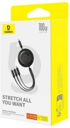 Univerzální kabel BASEUS Free2Draw 3v1 kombinuje rychlé nabíjení až 100 W, tři konektory (USB‑C, Lightning, Micro USB) a výsuvnou konstrukci se 4 délkami. Nabíjí až tři zařízení současně a podporuje přenos dat 480 Mb/s. Kompaktní naviják šetří místo a inteligentní čip chrání vaše zařízení.