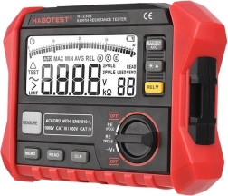 Tester zemního odporu Habotest HT2302 je vybaven velkým LCD displejem pro snadné čtení zobrazených hodnot. Umožňuje měření v rozsahu od 0Ω do 4,00kΩ s přesností a efektivními výsledky v dvoupólovém nebo třípólovém režimu. Přístroj je vhodný pro kontrolu zemního odporu a elektrické bezpečnosti.