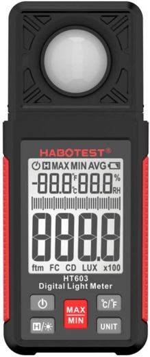 Habotest digitální světloměr zvládne měření intenzity světla v rozsahu 0~100000 LUX nebo 0~10000 FC, což jej činí ideálním pro široké spektrum aplikací jako je elektrotechnika či kontrola osvětlení v místnostech. Přístroj navíc dokáže měřit vlhkost v rozsahu 0 % až 99,9 % relativní vlhkosti a teplotu v rozmezí od -20 °C do +60 °C.