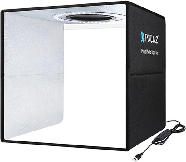 Součástí je 6 barevných pozadí (bílá, černá, zelená, červená, modrá, oranžová) pro rychlé doladění scény. Stan se snadno skládá, napájí se přes USB kabel (2 m) a umožňuje focení z více úhlů, včetně záběru shora. Vnitřní reflexní povrch rovnoměrně rozptyluje světlo pro konzistentní výsledky bez přepalů.