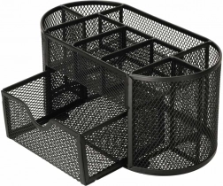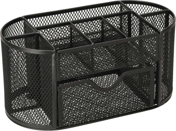 Praktický stolní organizér z odolné kovové síťoviny vám pomůže mít vše po ruce a na svém místě. Devět chytře rozdělených přihrádek pojme tužky, nůžky, pravítka, sponky i lepicí bločky, zatímco výsuvná zásuvka je ideální na drobnosti a poznámkové lístky. Díky otevřené konstrukci máte nad obsahem vždy perfektní přehled.