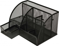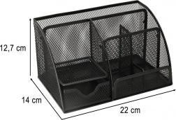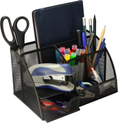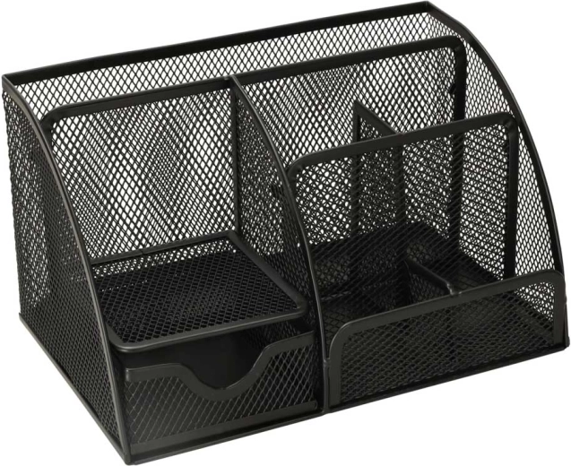 Odolná kovová síťovina v černé barvě působí elegantně, umožňuje okamžitý přehled o uložených věcech a skvěle se hodí do kanceláře, domácí pracovny i studentského pokoje. Organizér využijete také na kosmetiku, štětce na make-up či drobná nářadí.