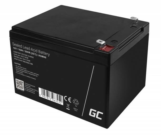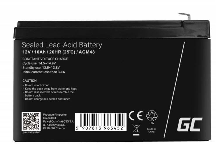 Baterie GREEN CELL AGM 12 V 10 Ah je konstruována pro spolehlivé napájení v režimu standby (vyrovnávací provoz) i cyklického používání. Technologie AGM se skelným separátorem bezpečně absorbuje elektrolyt, čímž zajišťuje bezúdržbový provoz, vyšší bezpečnost a minimalizaci úniků. Díky kompaktním rozměrům 151 × 98 × 95 mm a svorkám Faston 250 (F2) se snadno instaluje do široké škály zařízení.