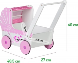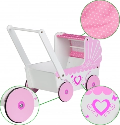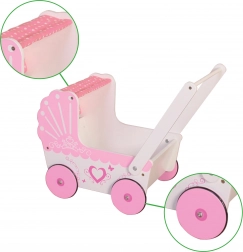 Dřevěný kočárek pro panenky ECOTOYS kombinuje bezpečí, stabilitu a kouzelný design. Jemné růžové srdíčka, oblouková stříška a ladné křivky dodají dětskému pokoji půvab a zároveň podpoří fantazii a sociální dovednosti při hře na pečování.