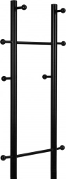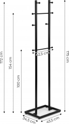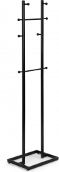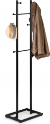 Pořádek na dosah ruky. Tento moderní stojanový věšák v matně černé barvě skvěle zapadne do každé předsíně, šatny i kanceláře. Práškově lakovaný kov zajišťuje odolnost proti poškrábání a dlouhou životnost, zatímco promyšlené rozmístění 8 háčků v různých výškách pohodlně pojme kabáty, bundy, tašky i klobouky.