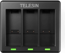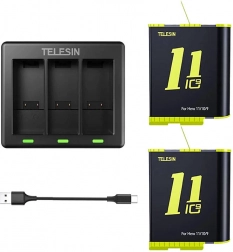 Balení obsahuje: tříkanálovou nabíječku Telesin, 2× nabíjecí baterii 1750 mAh, kabel USB‑C.