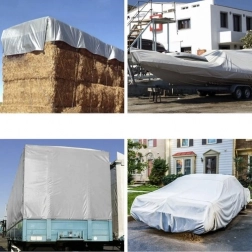 Ideální jako kryt proti dešti a slunci pro auta, lodě, náklad, dřevo nebo stavbu. Oboustranná plachta ve stříbrné/šedé barvě.