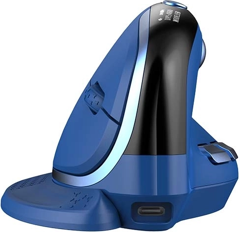 DELUX M618XSD je vertikální myš navržená pro přirozené držení ruky a minimalizaci napětí šlach. Integrovaný OLED displej zobrazuje stav baterie, režim připojení i aktuální DPI (600–4000). Díky baterii 1000 mAh vydrží až 2 týdny běžného používání a nabíjí se přes USB‑C.