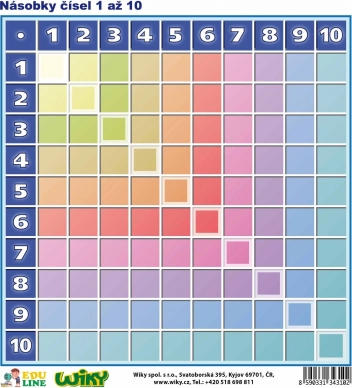 Tato praktická pomůcka nabízí jasné a barevně rozlišené řady násobků od 1 do 10, které dětem usnadňují pochopení vztahů v násobilce. Díky oboustrannému provedení můžete kombinovat učení s aktivním procvičováním – přední strana s výsledky pro vysvětlení, zadní strana bez výsledků pro ověřování znalostí.