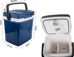 Díky napájení DC 12 V (auto) a AC 220–240 V (síť) je ideální pro auto, karavan, kancelář i chatu. Lehká, odolná konstrukce, praktická rukojeť a promyšlený vnitřní prostor s přihrádkami usnadňují organizaci obsahu a přenášení.