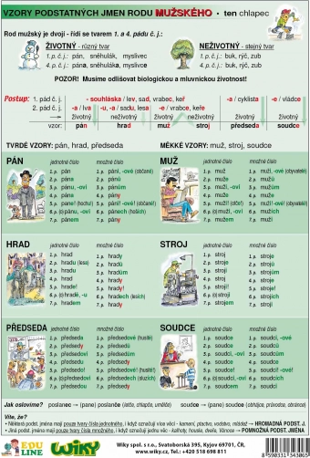 Tato přehledná výuková tabulka pomáhá žákům rychle se zorientovat ve vzorech podstatných jmen a správně je používat při skloňování. Jasné členění a srozumitelný popis podporují zapamatování i opakování učiva.