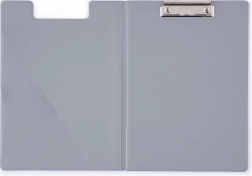 Uzavíratelná psací podložka s kovovým klipem ve stylové šedé barvě, vyrobená z extra pevné lepenky, ideální pro organizaci a ochranu vašich dokumentů.