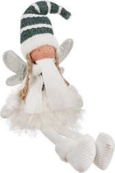 Pletená čepice, šála a botičky v bílé a tmavě zelené barvě dodávají figurce útulný vzhled a dokonale podtrhnou zimní a vánoční atmosféru domova.