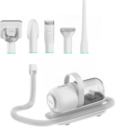 Součástí balení je 5 praktických nástrojů pro každodenní i sezónní péči: kartáč na každodenní česání, nástroj na odstranění podsady, elektrický strojek s hřebenovými nástavci 6/12/18/24 mm pro přesný střih, úzký nástavec a čisticí kartáč na chlupy z oblečení, koberců či pohovek. Všechny odstřižky a uvolněná srst jsou okamžitě odsáty do 1l nádoby, takže po úpravě není třeba složitý úklid.