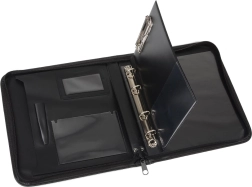 Elegantní diplomatka ve formátu A5 v matné černé barvě je ideální pro každodenní organizaci dokumentů. Nabízí uzavírání na zip, vnitřní kapsy na dokumenty a vizitky, úchyt na psací potřeby a 4kroužkovou mechaniku D20 pro přehledné zakládání.