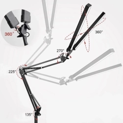 Regulovatelné rameno umožňuje rotaci v několika rovinách (360 / 225 / 270 / 135 stupňů), což zvyšuje flexibilitu použití. Montáž je možná jak pomocí úchytu, tak na stojan, což zajišťuje univerzální využití v různých prostředích, ať už doma nebo v kanceláři.