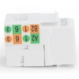 Díky přehlednému barevnému značení podle EIA/TIA 568 A i B a zářezovým svorkám LSA je instalace rychlá, přesná a bez nutnosti speciálních konektorů. Kompaktní bílá konstrukce se snadno zacvakne do standardních patch panelů a nástěnných rámečků.