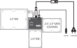 Současné připojení jednoho SATA a jednoho IDE zařízení urychlí přesun dat bez kopírování na interní disk počítače. Externí napáječ s vypínačem zajišťuje bezpečné používání i s většími 3.5" disky.