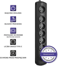Důraz na bezpečnost zajišťuje přepěťová ochrana s varistorem, integrované dětské pojistky ve všech zásuvkách a nehořlavý materiál PP. Díky možnosti montáže na nábytek a řešení pro navinutí přebytečného kabelu udržíte kabeláž pod kontrolou a prostor bude působit čistě a upraveně.