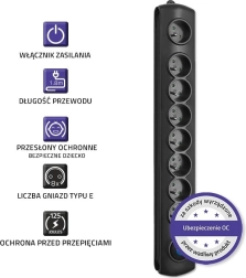 Hledáte univerzální řešení pro napájení více zařízení z jedné zásuvky? Tato přepěťová lišta přináší kombinaci bezpečnosti, ergonomie a designu. Díky 8 zásuvkám snadno připojíte TV, PC, nabíječky i kuchyňské spotřebiče a 1,8m kabel vám poskytne dostatek dosahu.