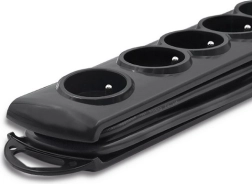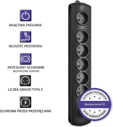Podsvícený nožní vypínač Quick Switch umožní snadné a rychlé zapnutí či vypnutí napájení bez ohýbání – světelná indikace jasně ukazuje, kdy jsou připojená zařízení pod proudem. O vaši bezpečnost se stará přepěťová ochrana s varistorem, dětské pojistky ve všech zásuvkách a nehořlavý PP materiál krytu. Výrobce si vyhrazuje právo na změnu technických parametrů.