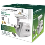 Výkonná elektrická mlýnka na maso ESPERANZA s motorem 600 W pro rychlé a efektivní mletí. Tři nerezová síta (2,7 / 4 / 8 mm) nabízí univerzální použití, nechybí nástavce na klobásy a kebbe. Stabilní provoz zajišťují protiskluzové nožičky a snadná obsluha potěší v každé kuchyni.