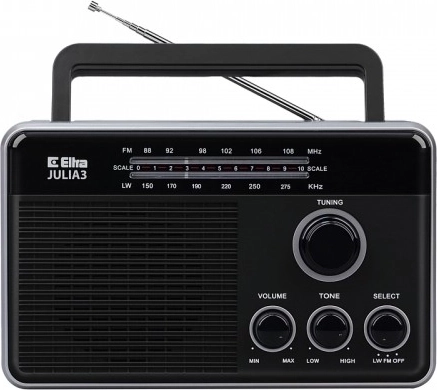 Kompaktní rádiopřijímač Julia 3 v elegantní černé barvě nabízí velkou a snadno čitelnou stupnici, pohodlné ladění a plynulou regulaci hlasitosti. Nechybí nastavení tónové barvy, sluchátkový výstup, otočná teleskopická anténa a duální napájení ze sítě i z baterií pro poslech doma i na cestách.